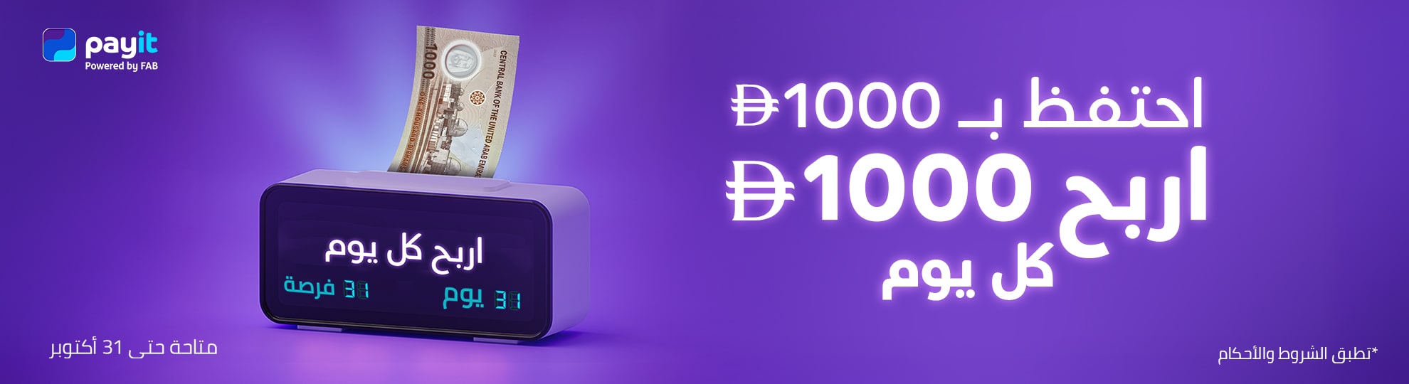 - تكافئ الحملة عملاء Payit المؤهلين عند احتفاظهم بحد أدنى من الرصيد اليومي يبلغ 1,000 درهم إماراتي في محفظتهم.