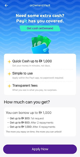 يوفر Payit OnDemand وصولاً سريعاً وموثوقاً للسيولة عبر التطبيق. يمكن للمستخدمين طلب التمويل رقمياً واستلامه مباشرة في محفظة Payit، مما يلغي الحاجة للتعامل مع المعاملات الورقية، أو التأخير، أو عدم اليقين.