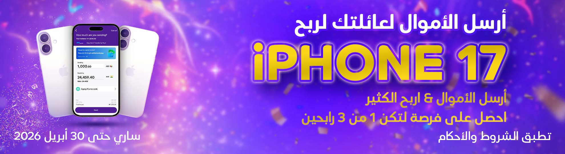 هذه الحملة الترويجية تُنظمها Payit (المقدمة من بنك أبوظبي الأول) بهدف تعزيز معاملات التحويلات الدولية بين مستخدمي Payit المؤهلين. سيتم إدخال العملاء المؤهلين الذين يقومون بإتمام معاملة تحويل دولي ناجحة خلال فترة الحملة تلقائيًا في السحب.