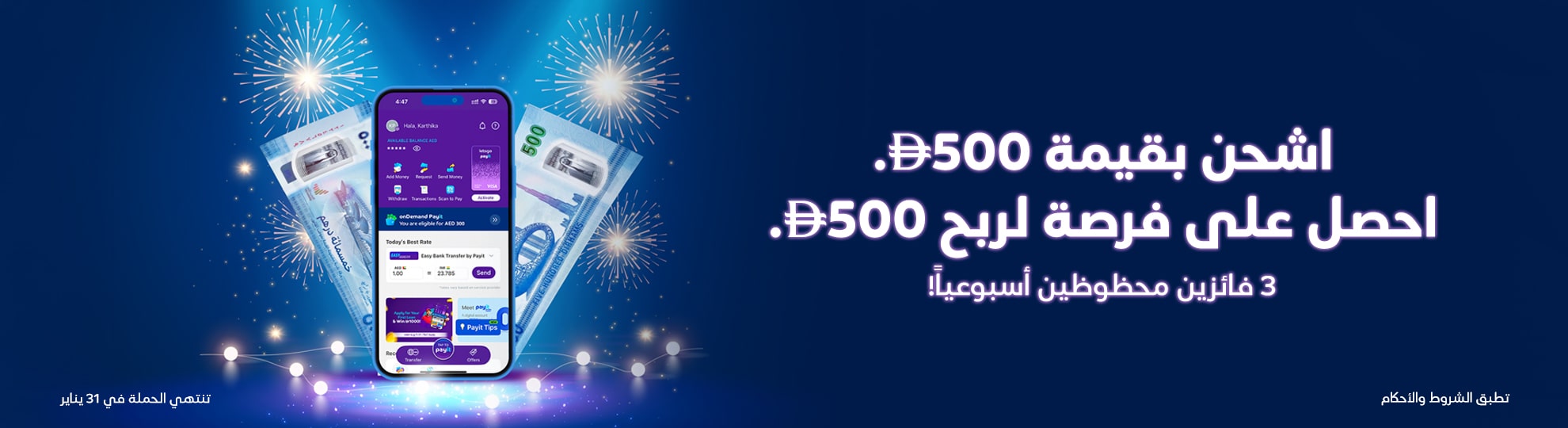 اشحن 500 درهم أو أكثر في محفظة Payit الخاصة بك، وادخل السحب الأسبوعي تلقائياً لفرصة ربح 500 درهم!