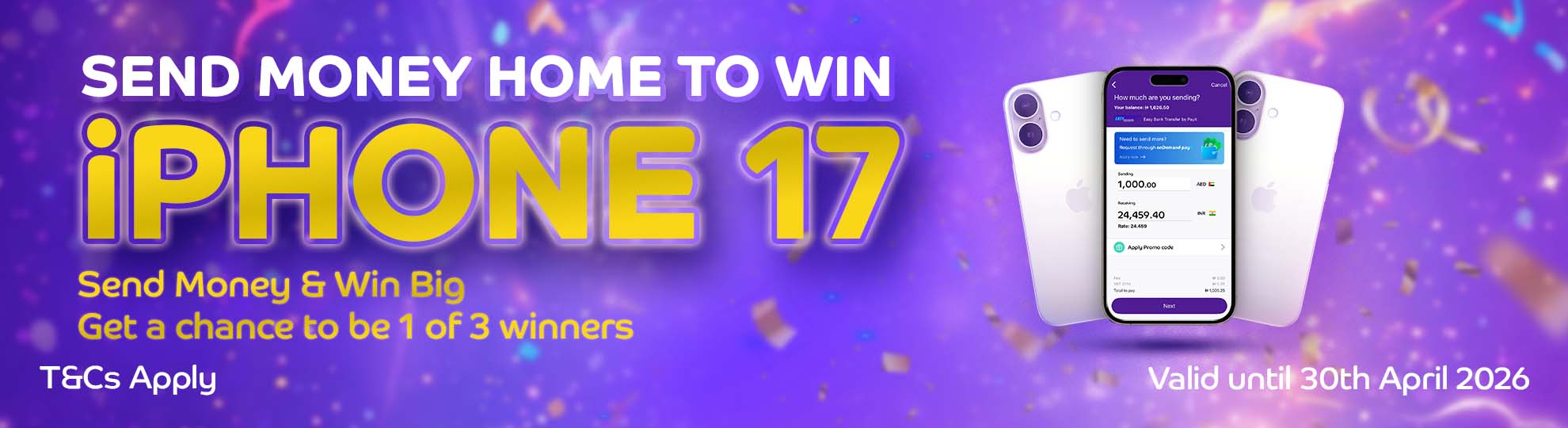 This raffle campaign is organized by Payit (powered by First Abu Dhabi Bank) to promote international remittance transactions among eligible Payit users. Eligible customers who successfully perform an international remittance transaction during the campaign period will be automatically entered into a lucky draw.